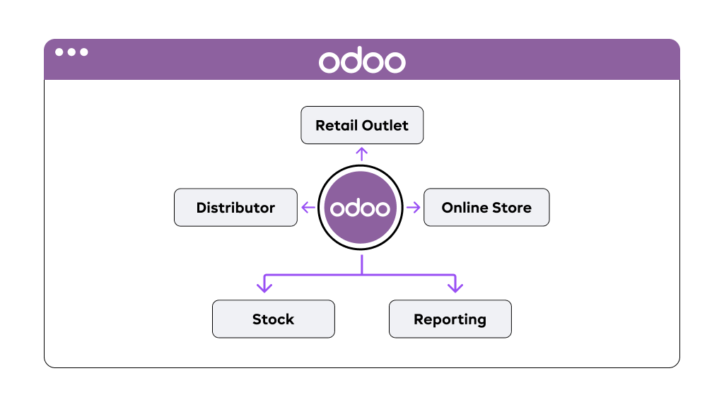 Sales at outlets flow back into Odoo, updating stock and feeding into planning for the next production cycle.