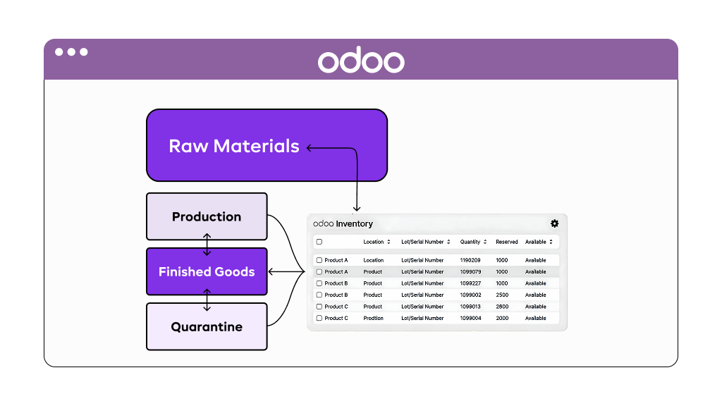 You can see how much you have by product lot and location across warehouses outlets and internal areas such as in transit quarantine or quality hold. This helps you plan production and deliveries without walking the floor or calling each warehouse.Lot and expiry tracking without extra spreadsheets