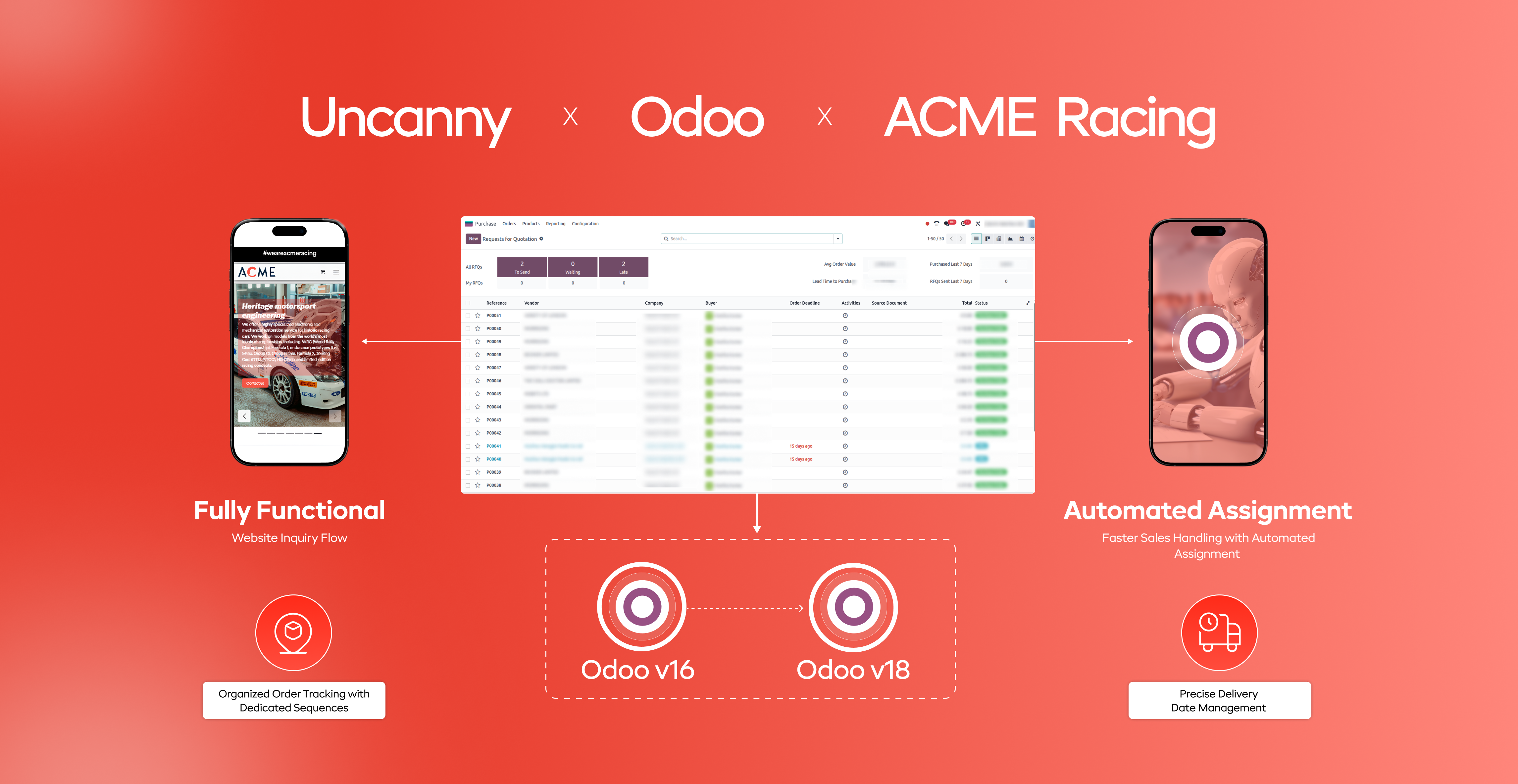 ACME Racing’s transition from Odoo v16 Online to Odoo v18 on Odoo.sh was a structural reset. Uncanny removed the noise caused by past studio customizations, restored accuracy across websites, and rebuilt the workflows ACME depends on every day.The result is a cleaner, better-organized ERP environment that gives their teams the visibility and stability needed to support future growth in the motorsport industry.