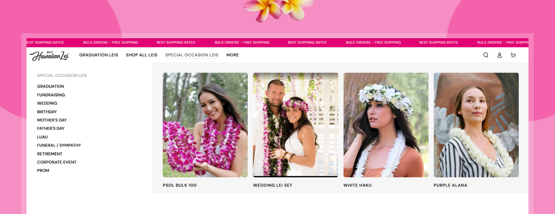A clear dropdown structure highlights lei types, gifting collections, and seasonal features. The goal is to make the first click obvious and reduce the time to the right product family.