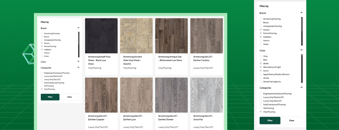 Data from multiple brand partners was consolidated into a unified catalog, confusing potential buyers with their options. We streamlined the experience by creating a catalog, allowing visitors to explore flooring options and generate genuine interest.